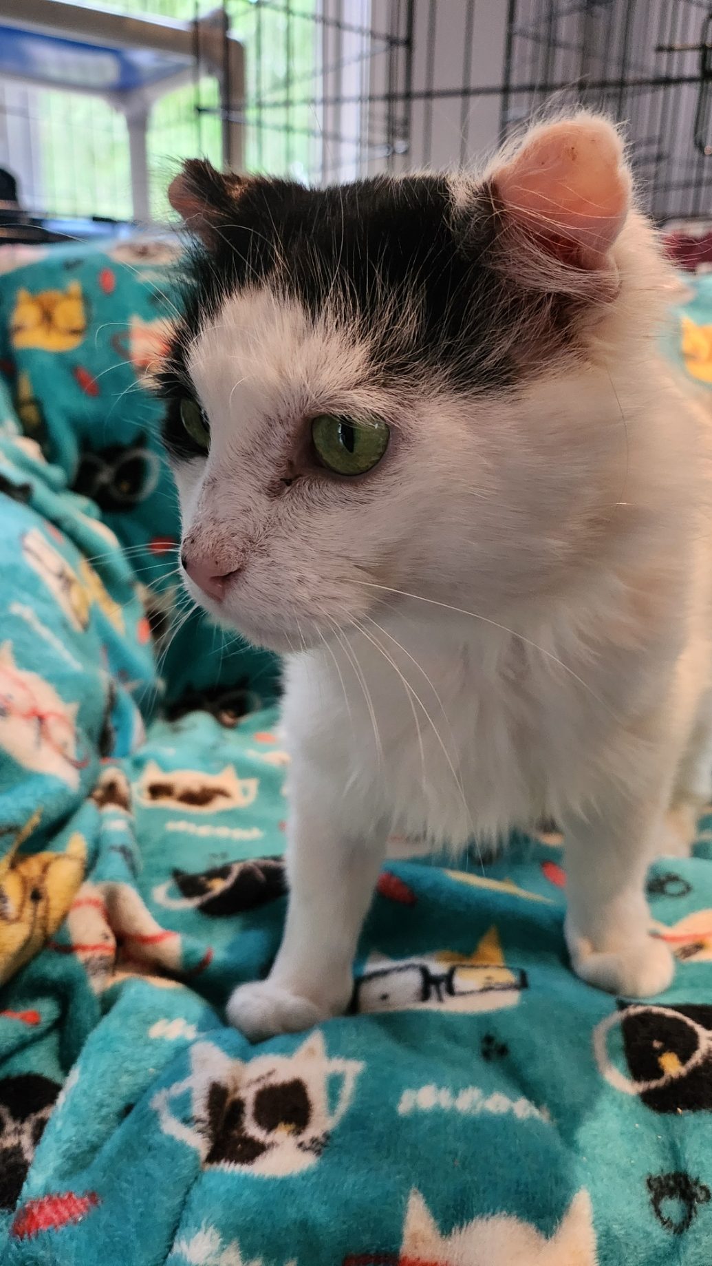 Norman was initially guarded, but he quickly relaxed after his rescue. His whole body softened, and at one point he reached for his foster mom with his paw and his head, as if to say “thank you for saving me”. Norman is also FIV positive. Unfortunately, there are FIV positive cats living in the area where Norman was found, and at some point (likely in fights with an FIV positive cat), Norman contracted FIV himself. However, FIV is NOT a death sentence. FIV positive cats can live long and normal lives. Norman will need to be kept as an indoor only cat for the rest of his life (unless his adopter might want to build a catio for Norman).